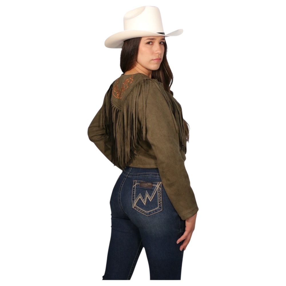 Camisa vaquera para mujer en gamuza suave en color verde, con flecos y detalles bordados que realzan su estilo western.