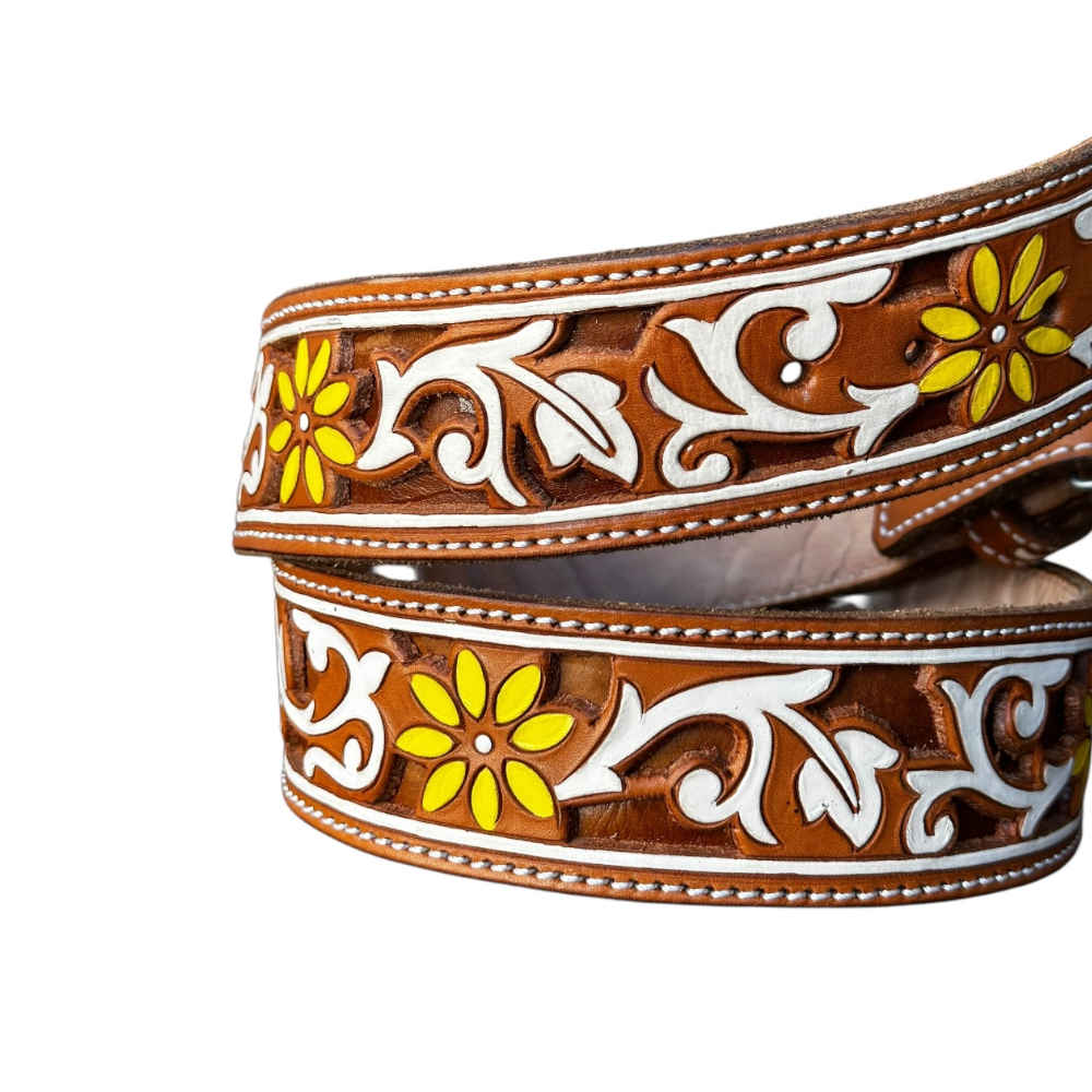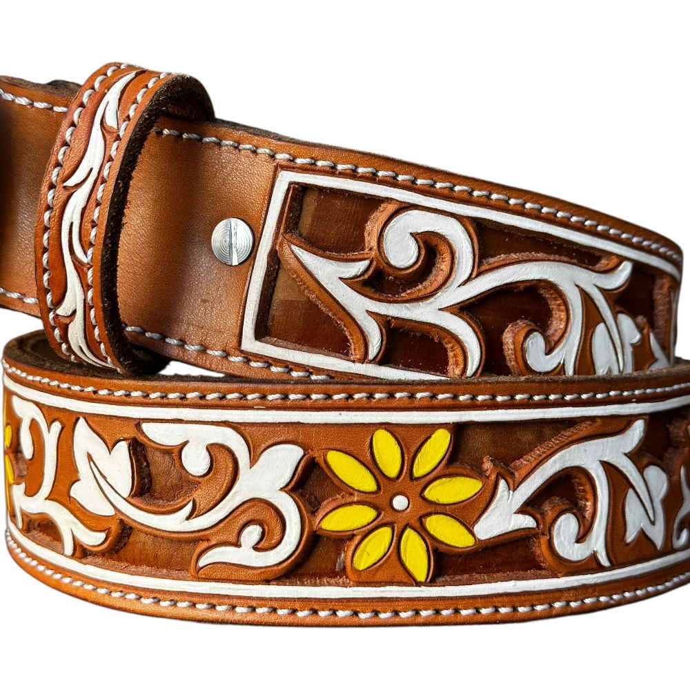 Cinto de vaqueta con un diseño cincelado y troquelado, un trabajo 100% artesanal y de la mejor calidad, perfecto para utilizar en cualquier ocasión, fácil de combinar y cómodo de usar.