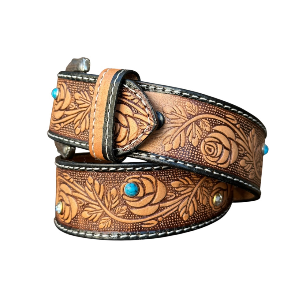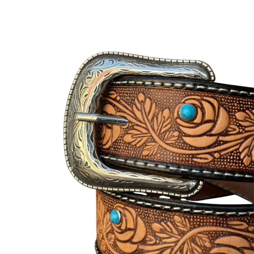 Cinto vaquero color natural con grabado de flores y aplicación de piedras, ancho de 1.5″