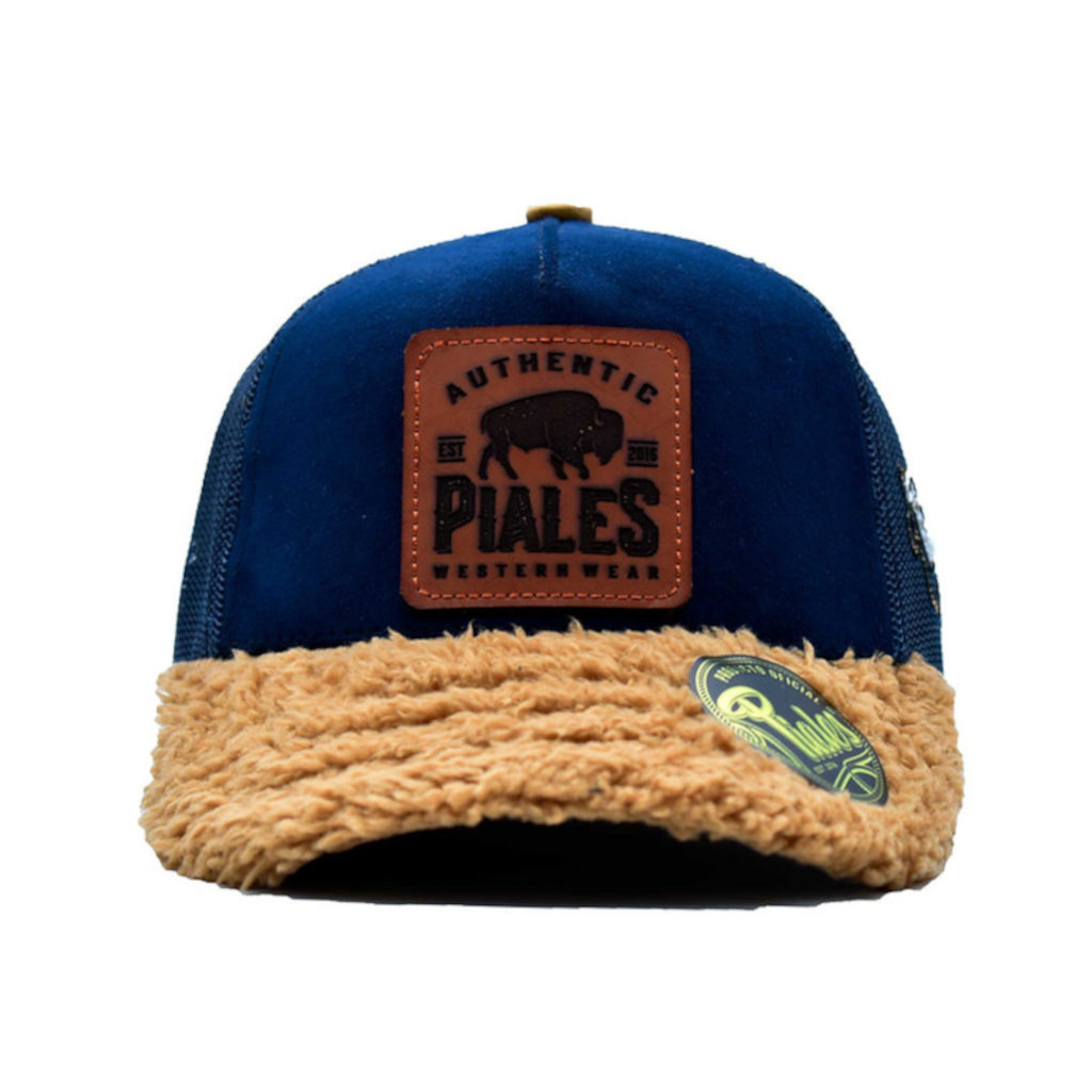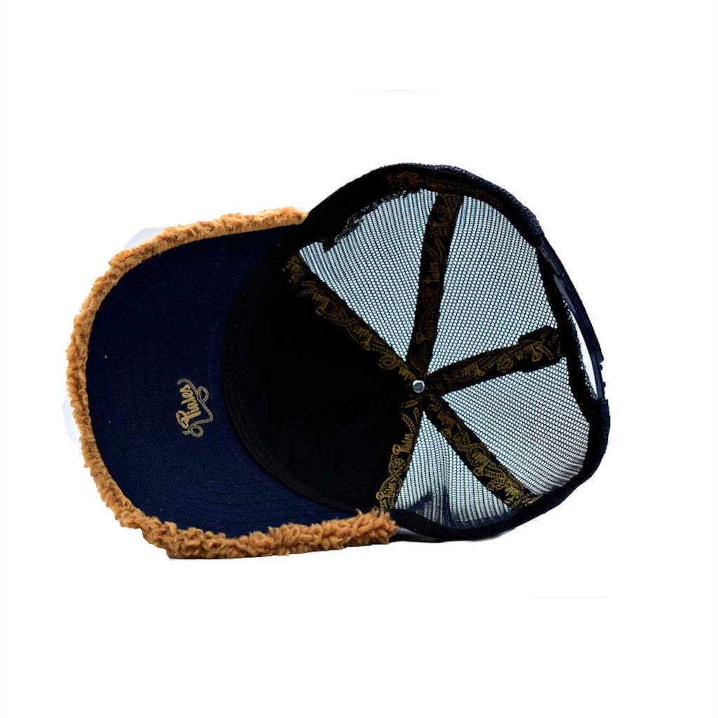 Gorra de malla azul con ajuste trasero y visera forrada tipo borrego para un look vaquero único. Ligera, fresca y con carácter de rancho en cada detalle.