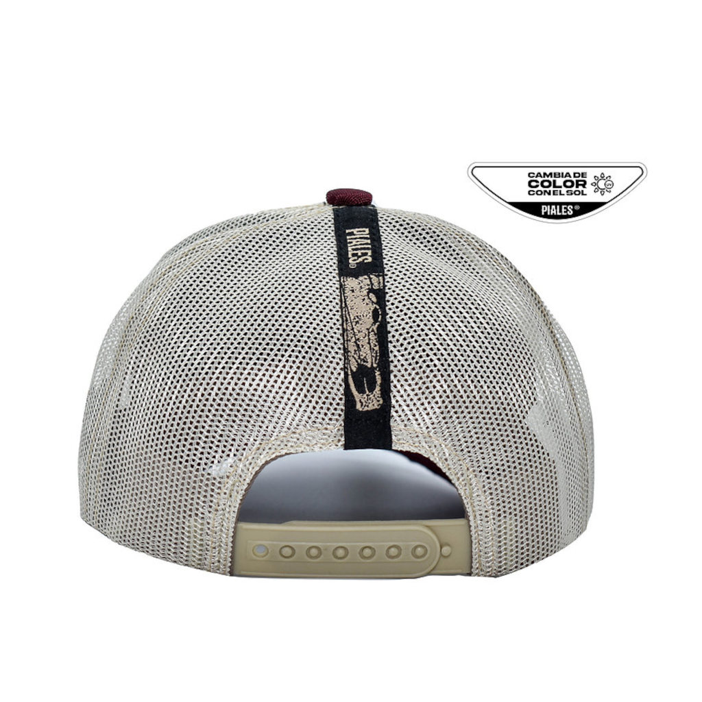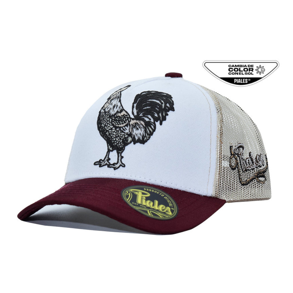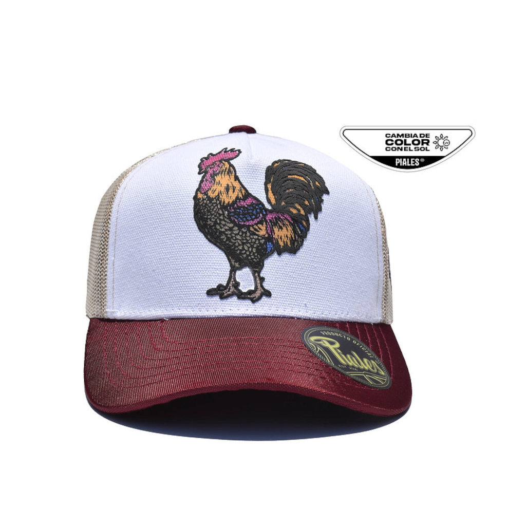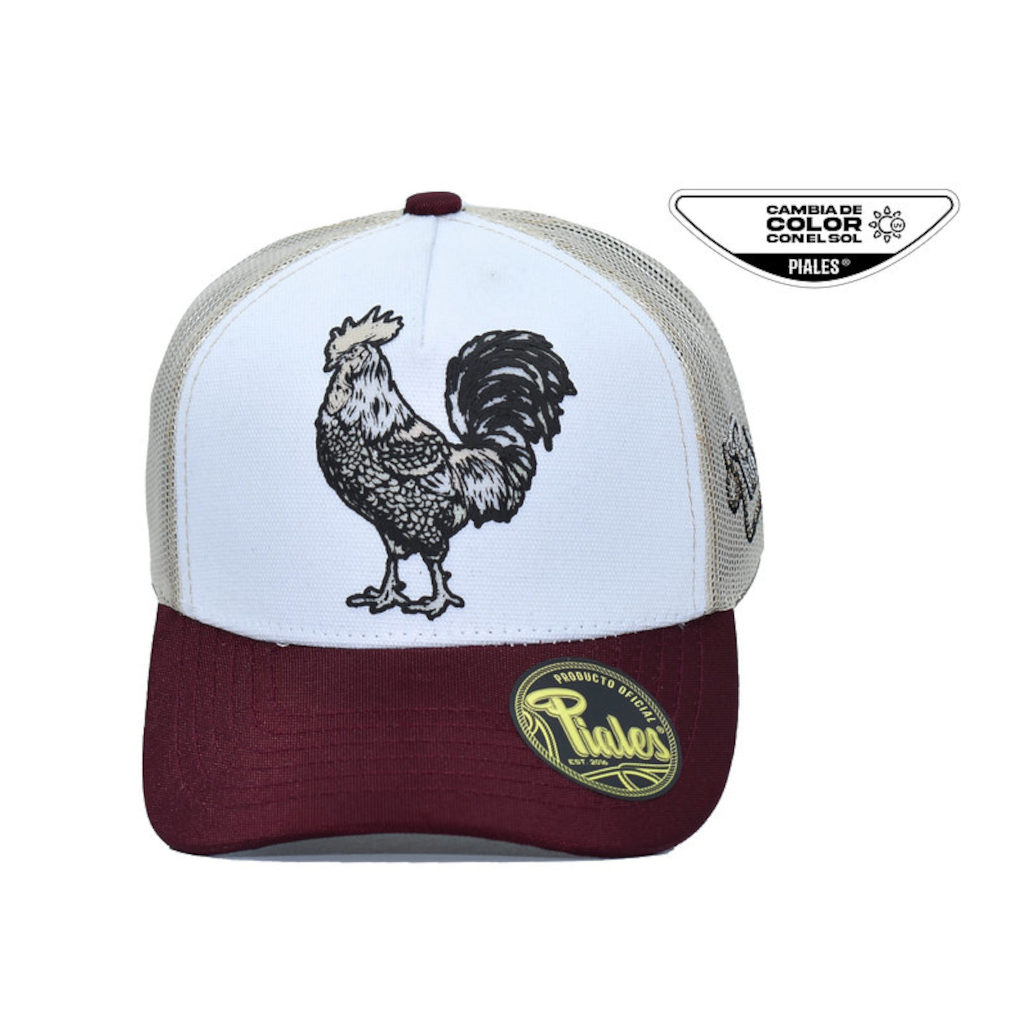 Gorra con logo de gallo, cambia de color en el sol, con malla, ajuste trasero y visera curva, Ligera, fresca y con carácter de rancho en cada detalle.